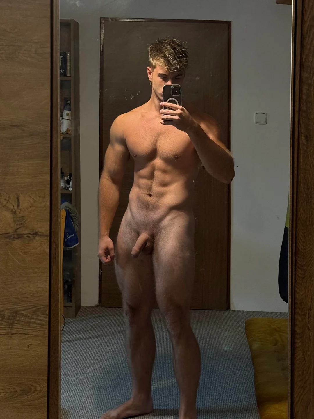 This nude muscle boy taking a selfie in the mirror is pure perfection. What a hunky body and gorgeous cock he is packing down there