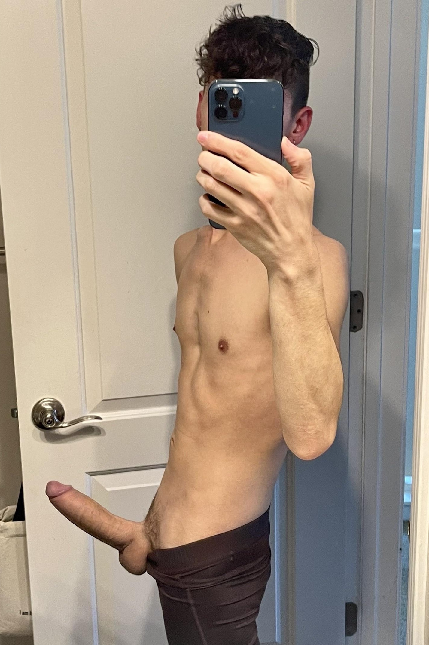Nude twink with a hot smooth body and a big uncut cock with trimmed pubes taking a nude self-picture in the bathroom mirror